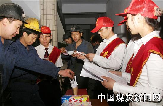 图为该矿青年班组员工积极开展安全宣传活动 图为该矿班组职工在查看自己的精细化日考核得分