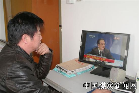 本网讯 近日随着全国“两会”的召开,在备受国人关注的同时,连煤矿工人也对“两会”投射出别样的目光,他们殷切期盼,国家在煤矿安全生产、福利待遇、维权等方面能够出台有利于矿工们的新措施,可见越来越多的中国人开始关注并参与到国家大政方针的制定、国家的改革发展建设中来。 图为陕西蒲白矿业白水煤矿职工观看温家宝总理会见中外记者并回答记者提问