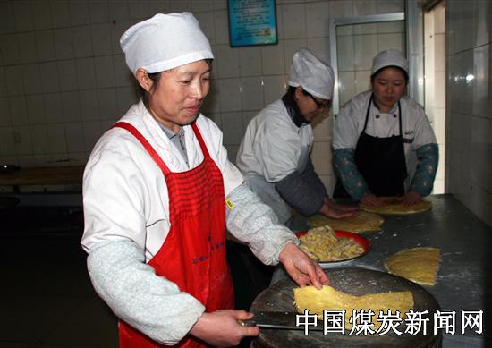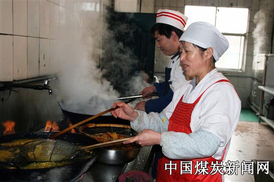 说起身体的事情,她乐观的眉头不禁微蹙起来,仅2005年到2006年间,她在工作中就犯过两次,每次都被同事们及时送往就近的白芨沟医院抢救,才脱险。前两年组织照顾她的病体,干些轻快活。去年红梁、大峰两矿合并,机构调整需要,为了方便职工就餐,食堂扩大规模,增加了3个食堂。服务人员、管理人员急缺。11月份,生活科科长刘玉生找到曾多年担当生活科班长的陈玉珍,请求她重新挂帅。并嘱咐她:“你身体不好,要多动口,少动手。” 严峻的现实需要和科长语重心长的话语,使陈玉珍又忙碌起来。 说的轻巧,做起来实在不易。对于干活麻利、眼光活络的老将来说。哪里都是活,哪里都要跑到干到,才能带动大家的积极性。每天早上6点准点走进灶房,赶在同事们上班前的半个小时里,她要查看食材存储情况、提前取出冻肉化冻,总结头天工作,理出头绪计划当天工作,做到班前会布置工作心中有数。在工作中,她手脚不闲忙里忙外,还随时注意排查各岗位的安全隐患。针对有的洗碗工偷懒不停电,总是带电冒着蒸汽端碗筷,容易烫伤的问题。她狠抓严管,终于制止了这个现象。每天晚上近8点下班回宿舍,陈玉珍给自己定下规矩:总是每三、四天抽查一次夜班工作,往往选择凌晨3点左右,掌握夜班动态。逢年过节,陈玉珍领着员工早班夜班晚下班两小时,中班早上班两小时,力争人人奉献两小时,炸麻花、油饼、糖花,烹制肉类熟食满足员工过节购买欲。 去年11月份红梁采区集中放假期间,生活科义务劳动,在多元公司农场挖葱拔萝卜干农活。陈玉珍在山上岗位值班,带领3名员工,接应冬菜负责晾晒。地上安排一个人捆绑绳子,另外3人在房顶拽,摊晒在回灶房顶。6亩地的大葱、萝卜全部摊好、铺开,数量大任务重。仅运货的大卡车就来回山上山下跑了许多趟。晚上9点多满天星斗的时候,又冻又累几乎没劲下来了,缓了20多分钟后才勉强下来。 今年春节前夕,井工采煤一队生产影响。晚上10点,通知电话打来:“抓紧准备51份班中餐,11点有车来接应送到井口。”已经回宿舍准备休息的陈玉珍立即赶到灶房,进行分工安排。这个时间,当天的饭菜基本售完,所剩无几。陈玉珍边安排人员边带头进行摘菜、切菜、切肉、焖米饭,中班7个人员和她在限定时间内抢先准备好51份米饭、烩肉菜,精心分装在一次性饭盒里随车送到井口。让采煤队员工及时吃上了热乎饭菜,虽然劳累使陈玉珍心口又疼起来,但是她却感到心里很踏实。 说起夜间的随机上岗事件不胜枚举。尤值一提的是,为确保证件齐全和食品质量安全,国家食品卫生要求送货单位长期固定。一家中宁鸡蛋供应商,每次一大早装车上路,赶到大峰矿就到了半夜11点半。一个多礼拜来一次,送货时间不固定,这就让陈玉珍夜半被吵醒的几率增加,深更半夜上岗为供应商过称、登记、开单入库。 今年已经47岁的陈玉珍用自己的实际工作践行着“干好分钟,负责60秒。”她常说:“这是个良心活,要心里踏实,就要对得起良心。” 陈玉珍在和同事们制作肉夹板 陈玉珍在炸带鱼