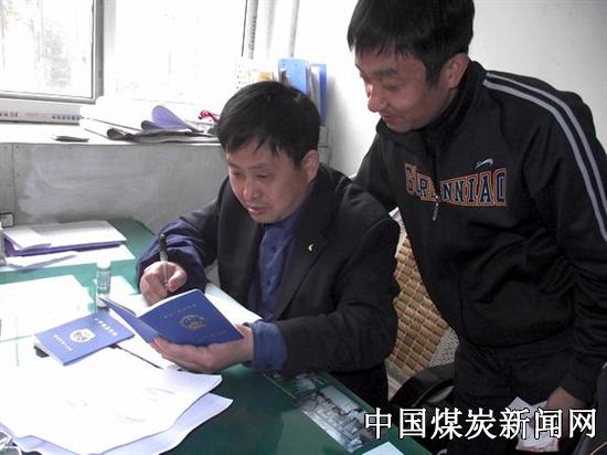 本网讯 安徽淮北矿业集团十分重视技术青工的培养。今年,集团公司做出规定,持有中高级工证的职工,奖金分别从每月的48元增至60元、 108元增至200元。此举调动了矿区广大青工学习技术的积极性。图为桃园矿综采二区核算员魏灵龙给青工王飞填写高级工申报表。