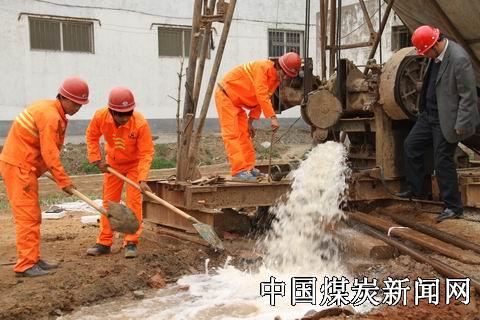 近日,河南省煤田地质局抗旱找水打井突击队在济源市思礼镇思礼村成功打出一眼水井,日涌水量达到2160立方米,解决了该村3000余口村民的饮用水问题。图为借着喷涌而出的清泉,钻机工人正在帮助老百姓浇灌土地。