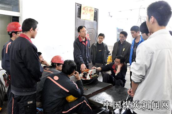 本网讯 4月14日下午,安淮北矿业技术比武状元、杨柳矿保运区队长张黎影(中)在矿机厂为职工现场传授真空电磁动起器的疑难故障处理(如图)。今年,杨柳矿实施了“金蓝领”工程,在绞车房、矸石山、运输轨道等地点办起了“漂流讲堂”,邀请技术比武状元、名师现场向不同工种职工传授技术“真经”,解决企业内部的“用工慌”。
