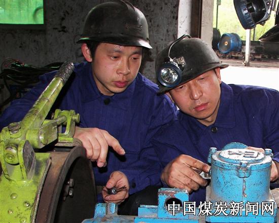 图为钱依顺(右)和工友正在检修提升小绞车。 ![]()