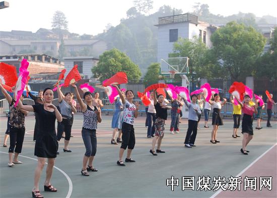 本网讯:(通讯员 王艳红 朱福洲 报道)湘煤集团周源山煤矿工会、女工委,为活跃矿区女职工、家属文体活动,进一步加强矿区两个文明建设,提高全民健康水平,早晚分别在矿区广场、居民区花园组织广场舞。图为矿工会秘书、女工委陈梅在球场,教扇子舞。