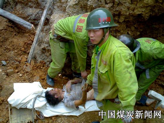 本网讯 2011年5月1日13时零5分川煤芙蓉公司救护消防大队接到110报警电话、报称“珙县巡场茨莉村三社(双山水泥厂)旁边山壁塌方有1人被埋,请求救援”。接到报警后,由值班队长邓红建率队员9人,立即赶赴事故现场,于13时10分到达事故现场,据现场人员介绍:大约在1小时前有1人在事故发生地挖黄泥,突然山壁塌方,并有1人被埋,随后向110报警。我队到达事故现场后与当地村民一起确认被埋者大概位置,了解事故情况,提出施救方案,用木棒将塌方周围固定,防止第二次塌方,救援人员冒着第二次可能塌方的危险,与现场群众一起利用锄头等施救工具进行挖掘,搬运黄泥,并派专人观察施救现场的安全情况,经过救援人员的奋力施救于当日16时05分将被埋者救出,经现场医生确认被施救人员已死亡,为此,救援任务安全地完成。