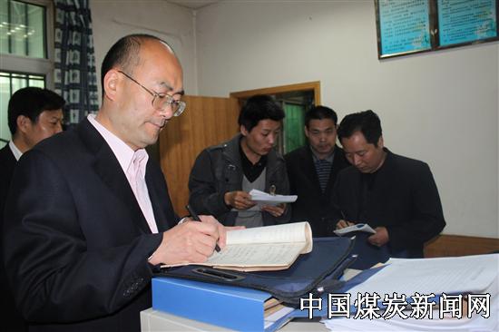 五一劳动节期间,陕煤化工集团陕煤建司组织工会、调度、人力资源等相关部门人员对所属单位矿级领导值班及下井带班情况进行了抽查。图为5月1日上午11时许,检查组在陕西双龙煤业公司检查矿级领导井下带班记录。特约记者:张战军文摄