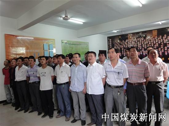 图一:为该矿综采队员工在班前歌唱《没有共产党就没有新中国》和《咱们工人有力量》等歌曲;
