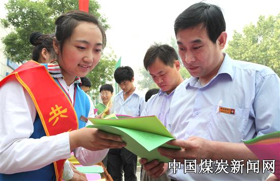 本网讯 6月7日,山能新矿集团举办《社会保障法》宣传日活动,6000多份宣传材料将发放到矿区职工家属手中,为他们及时了解各种社会保险法待遇和享受条件提供了方便。图为矿区职工正在通过宣传员学习保险法。