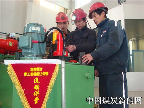杨柳煤业保运一区团支部,在坚持“四个一”青工理论培训的基础上,因地制宜、因陋就简地开展青工实操能力培训,通过“流动讲堂”,着力打造理论精、操作熟、应变快的复合型技能青工队伍,全力备战集团公司第二届“名师高徒”大赛。图为获得首届“名师高徒”大赛“十大高徒”称号的芦明刚(中)在为青工讲解副井液压站的检修技巧。