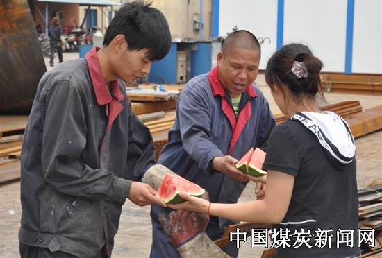 7月14日,淮北矿业工程建设公司安装管理部针对野外施工的特点,积极开展“送清凉、送关爱、保安全、保健康”(双送双保)活动,做好防暑降温工作,及时把清凉送到工地施工一线职工手中。 该管理部首先购置发放了风油精、清凉油、蚊香(片)器及敌敌畏、喷雾器等杀虫灭蚊用品;同时工会还购进了绿豆、白糖、西瓜和毛巾等消暑用品,送到施工现场;让奋战工地一线的职工,倍感清凉和关爱。图为当日协安员为工地职工送上甘甜解暑的西瓜。 ![]()