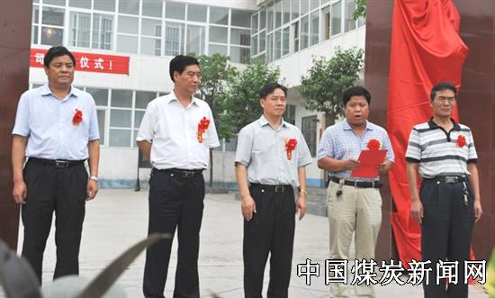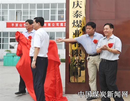 在鞭炮声中,公司党委书记董光德、董事长、总经理韩建设、庆泰煤业公司夏占有、高群山共同为庆泰煤业有限公司揭牌。