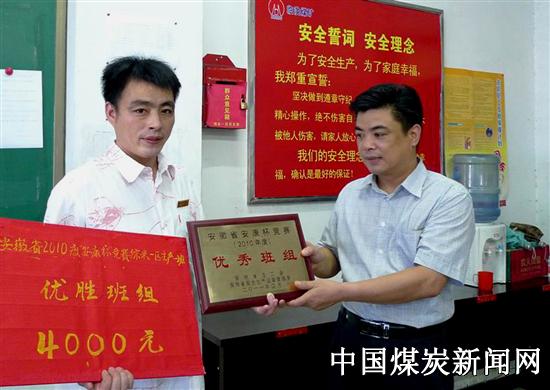 7月19日下午,安徽淮北矿业临涣煤矿党委副书记、工会主席潘富宝为综采一区生产一班送去了安徽省总工会、安徽煤矿安全监察局颁发的“安康杯”优秀班组奖牌,并给予该班组4000元嘉奖。该班从加强班组安全建设入手,把事故防范的责任落实到每一个岗位,每一个职工,通过群策群力除隐患,群防群治保安全,班组安全自主管理水平有了新提高,安全防范措施有了新完善,安全生产状况有了新突破,实现了零“三违”、 零工伤目标,工程质量一级品率始终保持在100%。