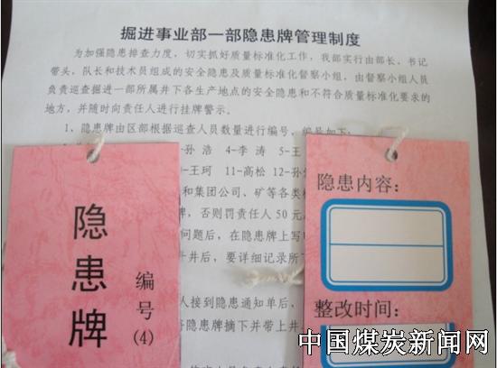 为加强隐患排查力度,切实抓好质量标准化工作,近日,皖北煤电五沟煤矿掘进事业部一部出台了《隐患牌管理制度》,重点对井下作业现场的各类隐患及时挂牌提醒,并落实闭合管理尽快整改。 该制度详细规定了对部长、书记、技术主管、技术员等不同人员在井下作业现场查找出隐患并挂牌提醒的措施方法。制度规定,对要求现场整改的隐患,及时挂牌提醒,并落实责任人进行限期整改,将挂牌的隐患登记列表。并随时跟踪监督和通报整改情况,做到整改一项、消除一条。该制度还规定了严格的考核处罚规定,对于发现隐患不挂牌的、对于挂牌限期未整改的责任人进行严肃处罚。 “小小隐患牌,安全大文章”,该矿掘进事业部一部用一张张小小的隐患牌,夯实安全基础,著好安全生产这篇大文章。 ![]()