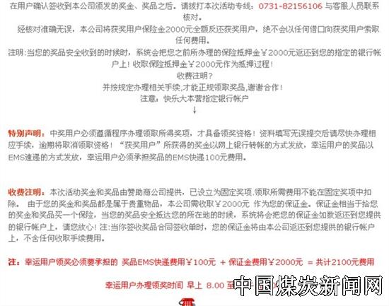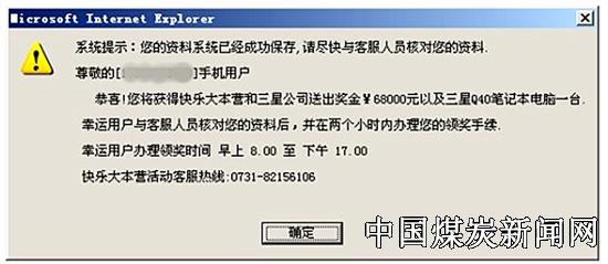 小月32岁,不算是湖南卫视快乐大本营的忠实观众,但也经常收看这个娱乐节目。她告诉记者,快乐大本营原本就在周六晚播出,而且也经常会有抽取幸运观众的活动,之前她也有给这个节目发过短信。因此,星期天一早收到这条信息时,她感觉是,自己真是幸运,竟然被抽取为幸运观众二等奖。 “这条信息很具有诱惑性。”小月说,这条中奖信息提的都是诱人的奖品,而还公布了网站还有验证码,让人觉得还挺象官方的。 到底是不是真的?先登录官方网站看看。记者点击了小月发过来的这个网址,发现跳出来的首先是“欢迎进入金鹰网(快乐大本营)活动网站!请仔细查看活动内容”一个提示框,点击“确定”后,就正式进入了“快乐大本营”主页。页面上有“快乐家族”的5名主持人的头像,有大本营讨论等栏目,还有活动的唯一客服热线电话。当然,整个页面的重点是在这个“面向所有手机用户的抽奖活动”中。活动分一、二、三等奖,奖品除了高额的现金外,还有汽车、笔记本电脑、手机等。 小月说,直到看到网页,她都还是半信半疑的。之后要输入手机号码和验证码,她抱着试试看的心态随意输入了一个手机号和验证码,结果竟然进入了。“这下我确定这又是一个骗局。” 记者发现一旦进入活动,就会弹出中奖的对话框,并让你输入大量个人信息和银行卡号。之后提示要求参与者交纳手续费、邮寄费、保险费等共计2100元。 同时,记者发现,百度类似快乐大本营中奖信息查询也被奇特删除。 下午,记者联系上“快乐大本营”相关工作人员,其称已有不少市民打来电话咨询过此事,“这是个骗局,我们根本就没有这样的活动,大家不要上当受骗。任何活动及信息都将在金鹰网官方网站上公布。” ![]() ![]()