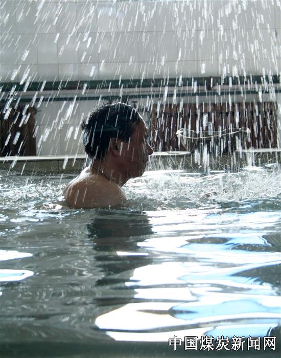 8月25日上午,淮北矿业临涣矿一名刚上井的采煤工正在淋漓尽致地享受清爽的池水。今年该矿为改善职工洗浴环境,在硬件上加大了投入力度,软件上提倡先淋后浴,保证每一个澡堂水清池净,为职工洗浴创造了良好的环境。