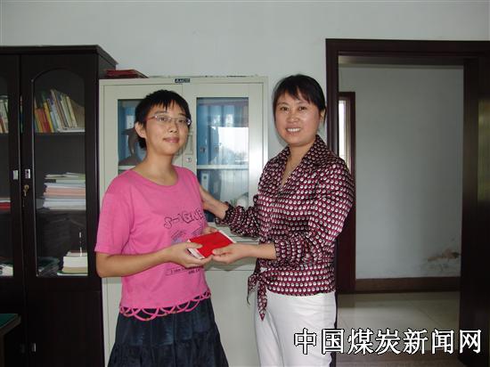 图为刘静在接受公司工会女工部发放的2000元救助金