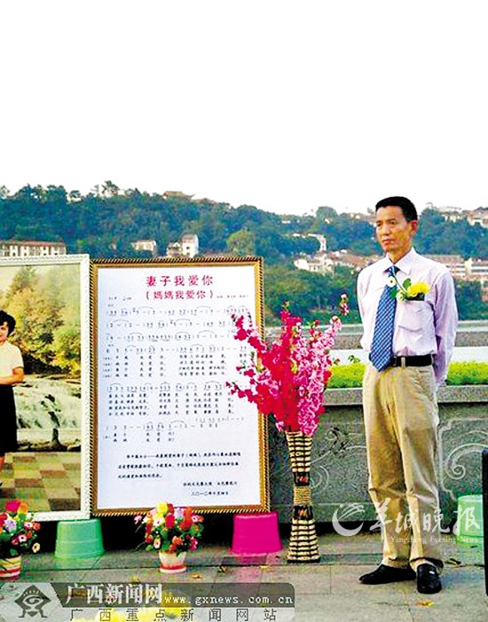 据南国早报报道,在人来人往的码头附近摆画像、“广告牌”、放音乐,8月25-26日,广西百色市民廖大熊连续两天以这样的方式祭奠亡妻。这种“高调祭亡妻”的行为,不少网友为之感动,也有网友表示质疑。 江滨竖牌祭亡妻 家住百色市共和街盐仓巷的廖大熊,今年55岁。8月25、26日,连续两天下午5时,衣装笔挺的他站在百色市江滨路大码头,表情严肃而凝重。 在他的右侧,《痛失爱妻也广告》、《我痛失爱妻一周年祭》的牌子,两幅亡妻李平凤的相片,以及一块印着《妻子我爱你(妈妈我爱你)》的歌牌,一字排开。在这些牌子前面,摆放着几盆鲜花。地面上还摆有两个盒子,装着与牌子上同样内容的宣传单。 廖大熊说,他很爱妻子和女儿,但遗憾的是,他妻子去年身患癌症去世了,他一直无法走出阴影。歌曲是他和女儿廖苑汀创作的,两张相片分别是亡妻30岁和40岁时拍的。廖大熊说,此举为的是诉说对亡妻的深深怀念,并且告诫天下所有夫妻,“不管风风雨雨,都要好好珍惜,一起携手走过”。 网友有赞也有弹 对廖大熊的举动,不少网友表示感动、佩服,“真是男人的榜样”,但也有网友是另一种声音。 “100个人中,会有100个人觉得,他是发疯了。”有网友说,廖的行为“太不合常情了”。他们认为,廖应该是将对妻子的爱深埋心中,或者转化为对女儿、朋友的爱,没必要这么张扬。有网友觉得,廖如此做,无非是想出名,或“让人给他捐钱罢了”。 廖大熊在接受记者采访时坦言,亲戚邻居并不支持他的这一举动,“家里人说我太张扬了,不给他们面子”。年迈的岳母也劝他,“不要拿着老婆的相片东搞西搞”。 据廖介绍,妻子去世几个月后,他曾举办过一次类似的祭奠活动。他事先邀请了20多名亲朋好友参加,结果只来了两个。不过,令他欣慰的是,女儿理解他,支持他。后来,他在《我痛失爱妻一周年祭》中,补上了这样一段话:“我不在乎别人说什么,我把初恋至今36年来,都为我牵肠挂肚的发妻,紧紧地吻抱在心里,就永远不孤独、不寂寞。”