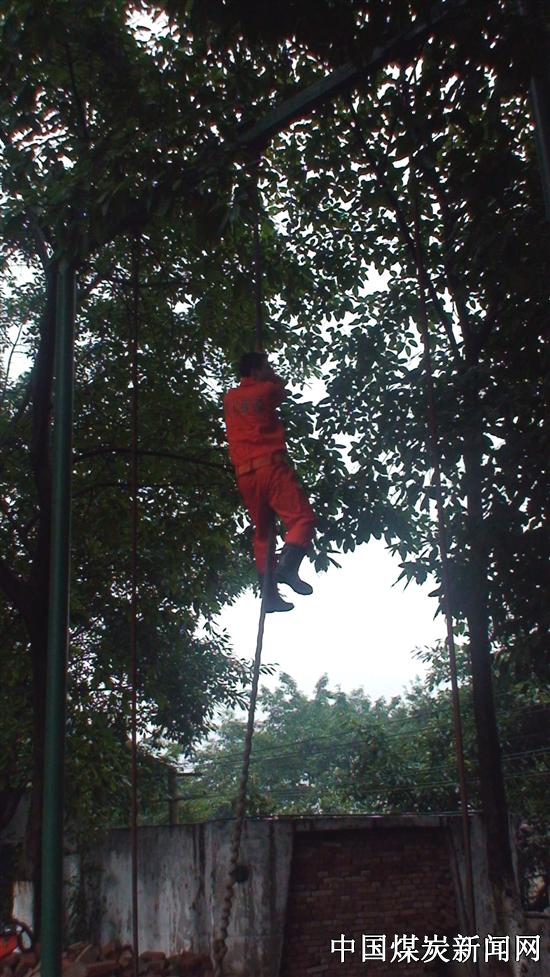 着装迷彩背心、运动短裤、运动鞋的选手严正以待,依次出场。首先,他们面对的第一项考验是爬绳,比赛要求选手在攀援过程中,不准夹绳,不准上跳,下放时姿势不限;攀援合格高度为3.5米,增加1米加0.5分。其次是12次的引体向上,此项要求选手正手握杠,引体时下额过杠,放下时两臂伸直,脚不能接触地面,增加一个加1分,未完成不计分。第三项耐力大考验:首先,选手们必须迅速换上战斗服、戴上救护帽、穿好统靴、固定好矿灯、佩戴好呼吸器,扛上灭火器进行1500米长跑;回到起跑线时,再拉检力器100次,拉动不响不计数,未完成不计分,负重跑步时搭车或被发现有其他违规行为,将取消比赛成绩,并罚200元。 从本次《考核实施细则》了解到,规定以上三环节总用时13分钟,每提前1秒加0.2分,超时者为不合格;对单项未完成者,除30元处罚外,将在以后的体能训练中背呼吸器进行训练。 最后,经过选手紧张激烈的比拼和考查人员的严格考核,王龙贵、曾晓蛟、杜祥伟分别以总分149.3、148.7、142.8获冠、亚、季军,同时,组织组将分别给予冠、亚、季军200、 150、100元的奖励。