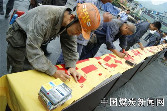 在签名现场,刚刚参加完政治学习的1000余名职工,在各基层队党支部书记的带领下,陆续秩序排队签名,在签名现场,工作人员还向矿工宣讲安全知识,提醒时刻不忘安全生产。
