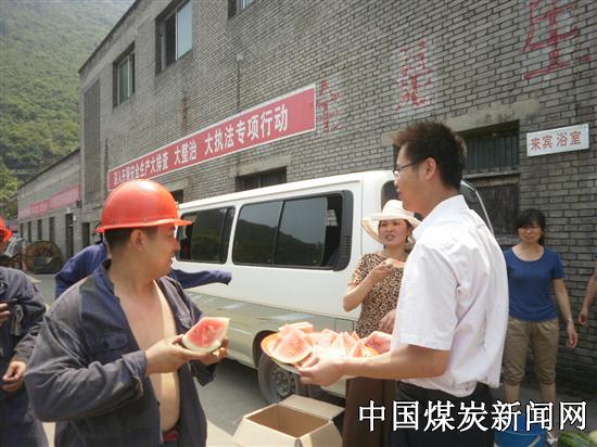 家属协管人员给职工送上一块块清凉的西瓜,一句句亲切的问候:“辛苦了!”、一句句温馨的唠叨“工作要注意安全!”传递给职工,炎炎夏日送去丝丝清凉。