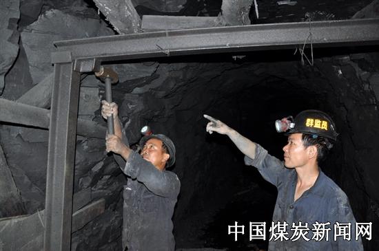 翠屏山煤矿群监员指导掘进工人校正钢支护