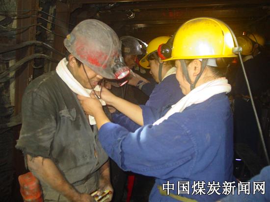 中秋节前夕,新陶阳公司团委组织10多名女工协管员,行千米巷道,把象征团圆平安的月饼、苹果等送到了正在井下工作的矿工师傅手中,并为他们亲手系上了毛巾和平安带,嘱咐他们按章作业,安全工作。图为:女工协管员在为工人师傅送上节日祝福。