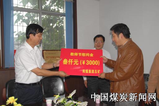 本网讯 (特约记者胡九潭)在第27个教师节来临之际,阳煤集团五矿领导带着企业对学校的深情厚谊,带着对中小学校和教职员工的亲切关怀和祝愿,深入到驻地中学、小学、幼儿园进行慰问,先后将33000元的慰问金送到了教职员工的手中,并对默默奉献在三尺讲台的教师表示由衷的敬意和诚挚的感谢。