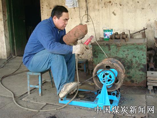 该地滑轮快速修制助力装置,具有设计合理,节省人力,节省时间,焊接密度均匀,提高工效等优点。图为发明者薛培柱在使用助力器焊接地滑轮。