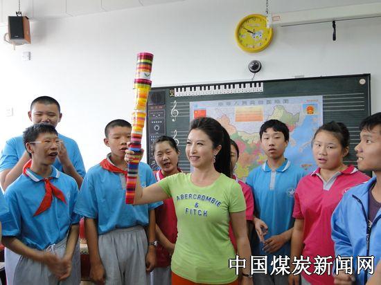 在参观了学校相关设施、学生宿舍、学生兴趣作品展览等后,刘媛媛来到多媒体音乐教室与学生们亲密互动,教唱歌,做游戏,通过中国地图为学生们讲解《国家》的概念。一位聋人儿童虽然听不到声音,但他能完整的用手语演绎《国家》,而一位三年级的智障儿童则拉着刘媛媛的手不放,表示《国家》这首歌是他每天起床的闹钟铃声,今天终于听到真人唱了。活动之余,刘媛媛还带来了前不久她参加大运会火炬传递时的那棒火炬与孩子们一起传递分享,“火炬象征着顽强勇敢,积极进取的拼搏精神和阳光、友好的美好祝福,希望这些孩子们可以发扬这种精神,快乐起跑,传递爱心!”被簇拥在孩子间的刘媛媛说道。