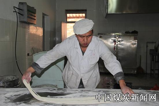 11月29日,阳煤集团宏厦矿建二部食堂炊事员正在拉拉面。今年以来,阳煤集团宏厦矿建二部职工食堂把保证一线职工饮食和增加饭菜品种作为一项重要工作来抓,积极为职工就餐提供便利条件,千方百计努力使矿工吃上可口的饭菜,近日,他们新建了一所宽敞明亮职工食堂投入使用,此举很受矿工的欢迎。