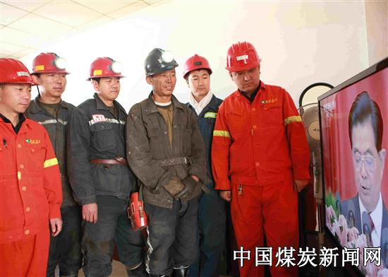 11月8日,同煤集团塔山煤矿职工通过电视、网络等多种渠道观看党的十八大开幕盛况,大家期盼着党的十八大能给煤矿职工带来更多的福音。图为:出入井员工在值班室纷纷围在电视机旁观看党的十八大开幕式。