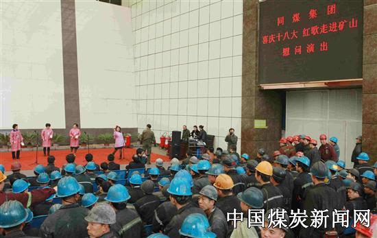 11月9日,同煤集团塔山煤矿到处红旗招展,彩球高悬,由同煤集团文委组织的“喜庆党的十八大、红歌走进矿山”文艺演出在该矿井口员工休息厅举行,歌舞,小品、三句半等演出让出入井员工捧腹大笑,让他们过了一个快乐,幸福的节日。图为:演员们以饱满的热情为矿工演出。
