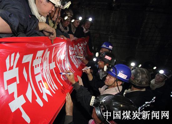 【本网讯】 恒源股份任楼矿认真贯彻落实党的十八大精神,把年终岁尾安全生产作为当前最重要的政治任务,明晰安全工作思路,采取有力措施全力向安全生产年目标冲刺。图为该矿修护区干群在中五回风总巷施工点签字宣誓安全生产。