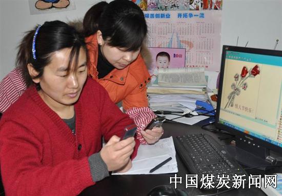 图为2月14日两名女工正在为自己的爱人或恋人发送安全叮嘱短信。