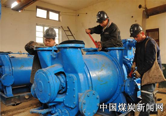 为加大瓦斯抽放治理力度,近期,河南煤化鹤煤二矿投资60余万元新建一座地面瓦斯抽放泵站,投入使用后将大幅提升该矿瓦斯抽采能力,为安全生产奠定坚实基础。图为2月20日,该矿抽放队职工正在新泵站加班加点安装瓦斯抽放泵。