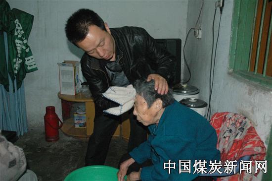 他给父亲洗澡这是常事,为了给父亲锻炼身体,防止肌肉萎缩和关节僵硬,每个星期两次他扶着父亲,到近1000米的花山矿职工澡堂去洗澡,途中要经过一个上坡和一个很长的下坡,由于他的父亲长期卧病在床,身体肥胖也及其虚弱,在行走时不但要扶着,而且每走一步都是缓慢而费力地向前移动着,走一会还要休息一会,洗一次澡需要两三个小时的时间。儿子给母亲洗澡,也许多数人闻所未闻,每个星期在家里,他要给母亲洗两次澡、洗一次头,家里经济困难,没有热水器,他只有用锅将水烧热后,倒在盆里,慢慢给母亲洗澡,这是几年来形成的惯例。