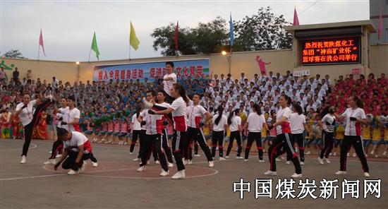 在雄壮运动员进行曲中拉开赛区开场帷幕。赛区开幕式表演了少儿团集操、男女生二重唱、搏击操、舞蹈等节目,将开幕式推向高潮。韩城矿业领导队同下峪口女队展开首场友谊赛,在一片叫好声中,韩城矿业公司代表队对西安重装公司代表队、实业集团代表队对蒲城清洁能源代表队展开了精彩比赛。 据悉,韩城分赛区比赛从5月17日至5月21日为期5天,采取10轮场次循环比赛,分别在韩城矿业下峪口煤矿体育场、桑树坪煤矿文体活动中心、象山矿井体育场5场次展开。5月21日晚10时,韩城赛区竟赛成绩将在桑树坪煤矿文体活动中心宣布。 图片:为韩城分赛区开幕式场景