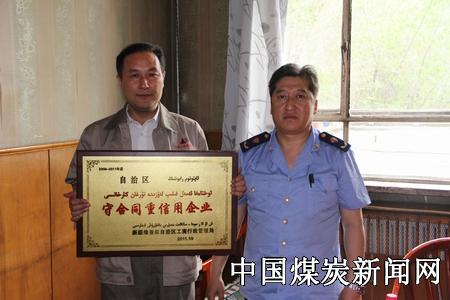 大黄山豫新煤业有限责任公司机关二楼会议室,为该公司颁发了由自治区工商局授予的2009-2011年度“守合同重信用企业”荣誉奖牌。