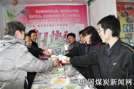 白芨沟煤矿女工委为不断增强员工的自主保安意识和家属联保安全意识,杜绝不安全行为的发生,充分发挥家属协管的安全生产第二道防线,定期组织家属协管员开展井下寻亲、井口“送温暖”、“不安全行为人员”帮教会等形式多样的亲情感召活动,为安全生产当好后勤。图为该矿女工委正在为井下员工过“集体生日”。