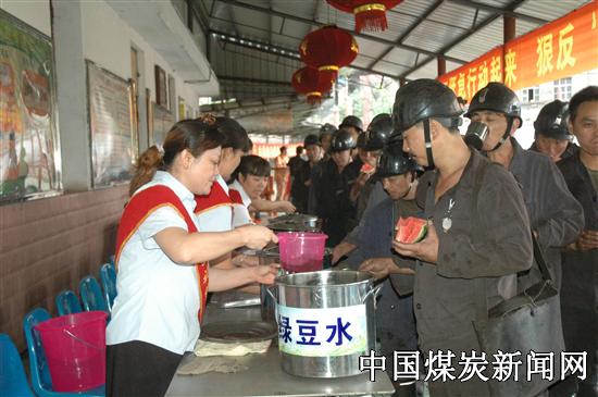 该矿工会还在井口茶水站,为上下班的职工送上西瓜、绿豆汤、菊花茶等消暑饮用品。满面笑容的矿嫂,不时为过往的职工递西瓜、端茶送水,下班的职工饮用完茶水后,工作中的疲惫感慢慢消失,上班的职工身体增添几分清爽。在此次送清凉活动中,共发放夏桑菊、板蓝根防暑药品2000余袋,用去茶叶、绿豆和西瓜等消暑饮用品近1000斤。