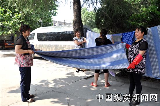 为充分发挥女工半边天作用,河南煤化焦煤集团白云公司女工委经常组织女工协管员深入区队讲安全,走到井口送祝福,进入员工家中帮教“三违”,来到员工单身公寓洗补衣物,受到了员工的好评。图为女工协管员在为生产一线员工洗晾床单的情景。