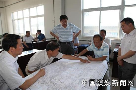 专家组和公司领导围坐在《金华山煤矿井下生产布局图》前,就如何规划设计、科学布局、矿井长远发展等方面“排兵布阵”。