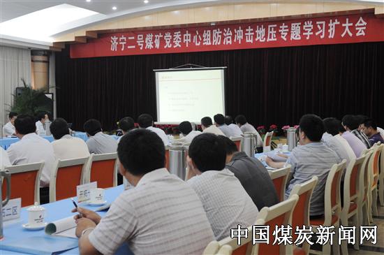【本网讯】 6月14日,在济二矿四楼多功能会议室,在家的党政领导、各科室、部门以及来自基层各单位负责人58人聚精会神地听讲。整个会议室气氛活泼而严肃,讲解者用通俗易懂的专业术语,图文并茂的方式,以案例剖析的形式,讲解了冲击地压的形成预控、防治措施,大家时而在笔记本上奋笔疾书,时而热烈讨论。这是该矿进行的党委中心组防治冲击地压专题学习扩大会的场面。