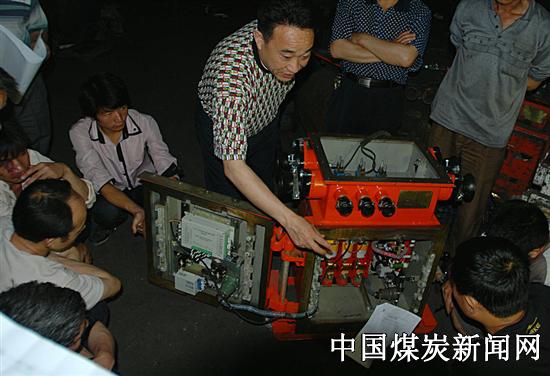 为提高煤矿安全保障能力,淘汰不符合国家有关法律法规规定、存在安全隐患的设备及工艺,预防事故发生,遵照安监总局《关于发布禁止井工煤矿使用的设备及工艺目录》所列项目,禁止使用BKD9系列矿用隔爆型真空馈电开关的有关规定。比德煤业公司购买了40台KBZ—400660/664D智能防爆开关。并从厂家请来专业技术人员进行培训,以期强化机电技术管理者的水平,提高操作人员的应知应会技能,以免事故发生。图为学习培训现场。