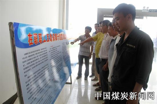 近日,皖北煤电集团朱集西煤矿工会开展了以"平时献出一份爱、难时拥有互助情"为主题的互助保障宣传周活动,发扬互助互济的优良传统。图为该矿员工正在观看互助保障宣传牌板。(王新喜)
