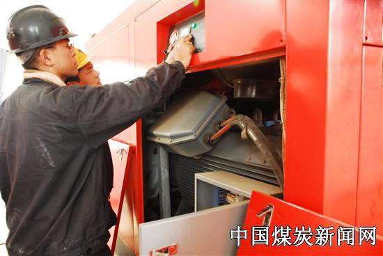 为保证机电设备的安全正常运行,鹤煤九矿定期对全矿机电设备进行安全大检查,加大对设备的检修力度,确保安全生产。图为8月13日,该矿机电一队职工正在对风压机进行安全监测。