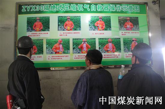 本网讯(李艳平 谢文峰报道)为更好地保障职工生命安全,近日,川煤集团攀煤大宝顶矿为全矿3000余名职工更换了新型自救器。据了解,此型号为ZYX30的隔绝式压缩氧气自救器是目前矿用最新型自救器,小巧轻便、安全舒适、性能稳定可靠。为使职工更好地掌握自救器的使用方法,该矿在组织专业人员进行培训的同时,制作了自救器操作示意图,并将示意图发放到各班组。图为该矿职工正在观看自救器操作示意图。