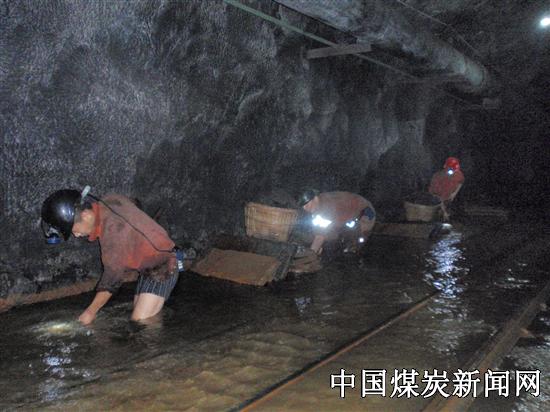 可由于珙泉煤业的主平硐设计排水能力不足,在两台500 m3/k的水泵同时排水时,巷道内的积水就无法得到及时排出,造成巷道里的人行道和机车运行轨道被淹,严重影响行人和电机车的运行安全。为防患于未然,确保井下安全度汛,减少生产影响和及时消除水患,危难之时珙泉煤业救护队勇挑重担,队党政领导亲自带领所属救护队员,采取分区、分段的作业方式,忍受着水沟内那臭气熏天的杂物的刺鼻味道,在没过膝盖的积水中艰难的疏通堵塞严重的水沟并对杂物等进行全面清理,经过连续两天的奋战,已将堵塞段的水沟内的矸石、淤泥和杂物彻底清理完毕,保证了行人和电机车的运行安全,顺利完成了领导交办的任务。 由于地表水的渗透具有一定的滞后性,目前,珙泉煤业“雨季三防”小组正严阵以待密切关注井下涌水量的变化,以确保“雨季三防”工作万无一失。