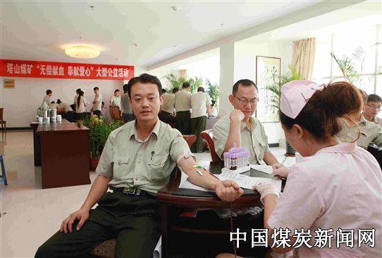 8月3日上午,塔山煤矿开展了“无偿献血、奉献爱心”大型公益活动,来自全矿各单位201名员工参加了无偿献血活动,多年来,塔山煤矿领导非常注重员工整体素质的提升和社会责任意识的培养,多次组织矿工参加无偿献血和应急献血活动,为保证全市临床用血工作做出了积极贡献,展示了新时期煤矿工人的优良品质和良好精神风貌。图为:塔山矿员工踊跃献血。 摄影:赵军