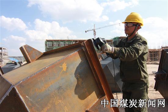 年产50万吨电石一体化项目是陕煤化集团神木电化发展有限公司今年的重点工程项目,为了使项目早日建成投产,努力打造公司新的经济增长点,电化公司各外包单位合理安排工序、科学组织生产,紧紧抓住陕北地区有利的施工季节,采取交叉作业与平行作业共同进行的方式,全力完成各节点目标任务。图为安装工人正在冒酷暑、顶烈日,加工电石厂配料站称量斗。